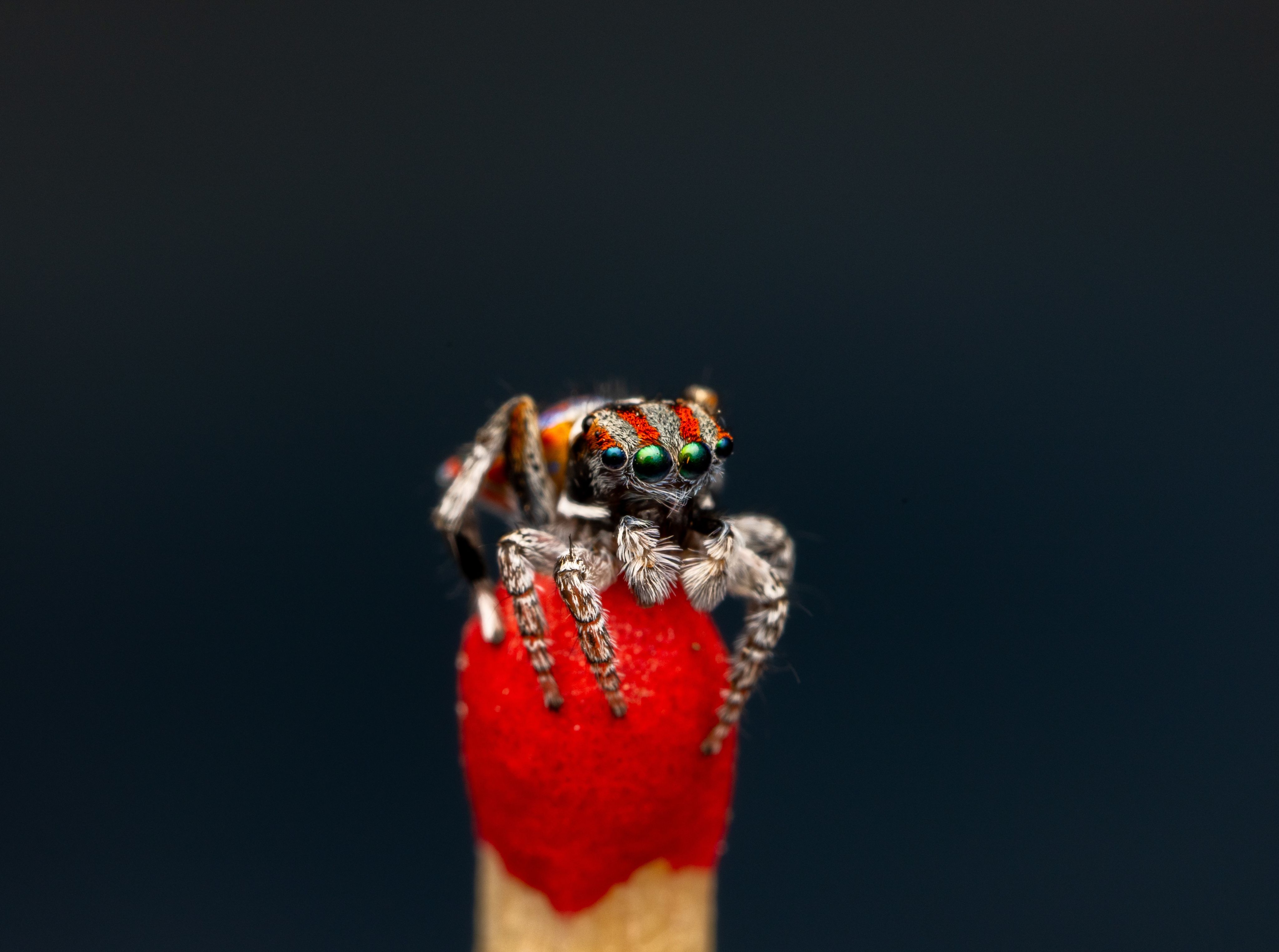Male peacock spiders only develop their colouration and patterning once they go through their final moult and become sexually mature; before then they are as camouflaged as the females. The spiders are visually guided and have eight eyes with two eyes in the centre being larger because they actively chase prey rather than building webs. "They have incredible depth perception but struggle to see something in front of them unless it is moving,” Jonah explains. “Once the male spots a female moving, he starts his courtship dance by putting up his colourful abdomen and waving an elongated pair of legs."